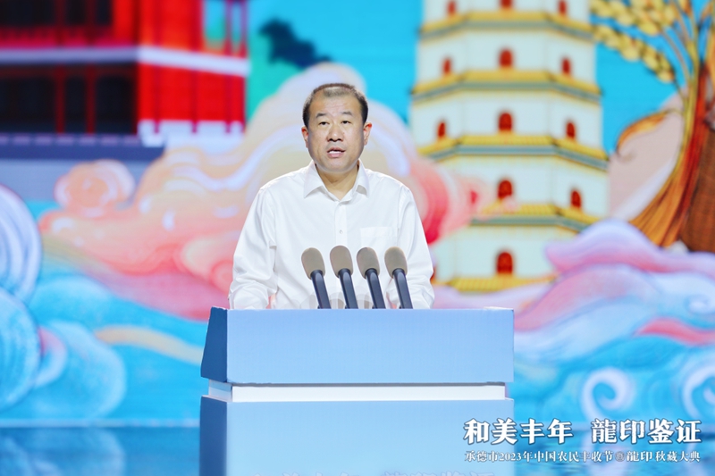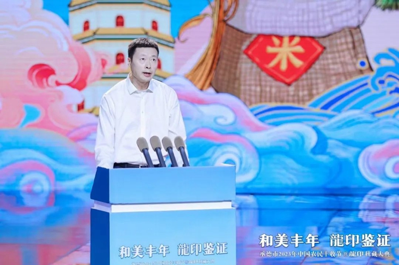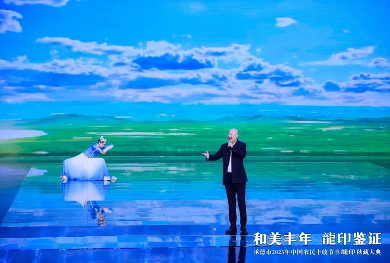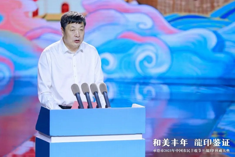 整場慶典以記錄承德人民美好生活、美景美食、農(nóng)業(yè)碩果的視頻《承德十二時(shí)辰》拉開帷幕。承德市人民政府副市長崔萬峰率先上臺致辭,并對承德市2023年中國農(nóng)民豐收節(jié)暨龍印秋藏大典的召開表示熱烈祝賀。