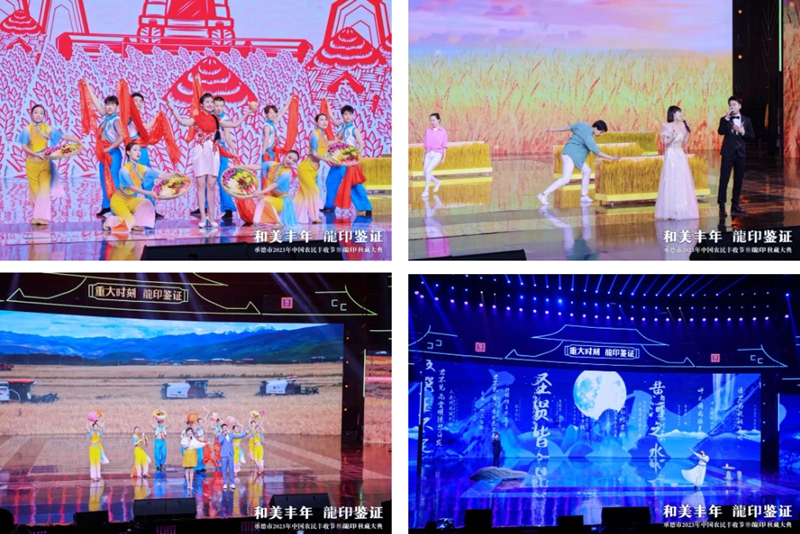 活動(dòng)中,情景劇《歷史上的1717》通過舞臺技術(shù)實(shí)現(xiàn)康熙皇帝與趙弘燮跨時(shí)空對話,再現(xiàn)了“金木水火土,板城燒鍋酒”的傳奇故事,在無數(shù)板城人心中蕩起層層漣漪;《豐收中國》、《風(fēng)吹麥浪》、《豐收進(jìn)行曲》等歌曲唱盡了農(nóng)民的喜悅,以及他們砥礪奮進(jìn)的決心。