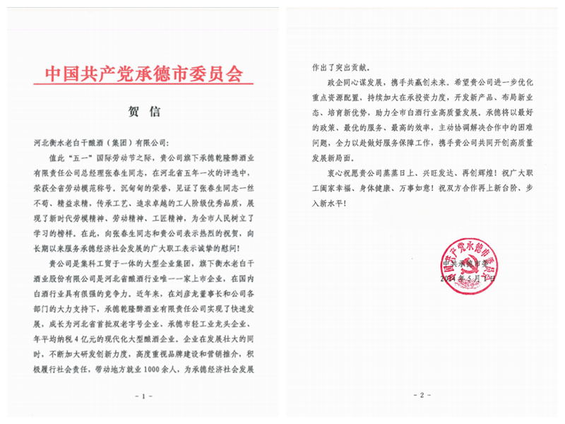 河北衡水老白干釀酒集團(tuán)收到一封來(lái)自承德市委的賀信,賀信主要內(nèi)容是對(duì)河北衡水老白干釀酒集團(tuán)子公司承德乾隆醉酒業(yè)(板城酒業(yè))黨委書(shū)記、總經(jīng)理張春生榮獲“全省勞動(dòng)模范”稱(chēng)號(hào)表示祝賀。祝賀信中講到:“張春生同志一絲不茍、精益求精,傳承工藝、追求卓越的工人階級(jí)優(yōu)秀品質(zhì),展現(xiàn)了新時(shí)代勞模精神、勞動(dòng)精神、工匠精神,為全市人民樹(shù)立了榜樣,近年來(lái),企業(yè)在發(fā)展壯大的同時(shí),不斷加大研發(fā)創(chuàng)新力度,高度重視品牌建設(shè)和營(yíng)銷(xiāo)推介,積極履行社會(huì)責(zé)任,帶動(dòng)地方就業(yè)1000余人,為承德經(jīng)濟(jì)社會(huì)發(fā)展作出了突出貢獻(xiàn)。”張春生作為制造業(yè)(工業(yè)領(lǐng)域)的翹楚,先后獲省“三三三人才工程”人選、河北省企業(yè)家協(xié)會(huì)先進(jìn)工作者、河北省食品行業(yè)年度人物、中國(guó)商業(yè)聯(lián)合會(huì)科學(xué)技術(shù)獎(jiǎng)、全國(guó)商業(yè)科技進(jìn)步獎(jiǎng)-特等獎(jiǎng)、2020年與2022年度分別榮獲河北省優(yōu)秀民營(yíng)企業(yè)家等多項(xiàng)榮譽(yù)。