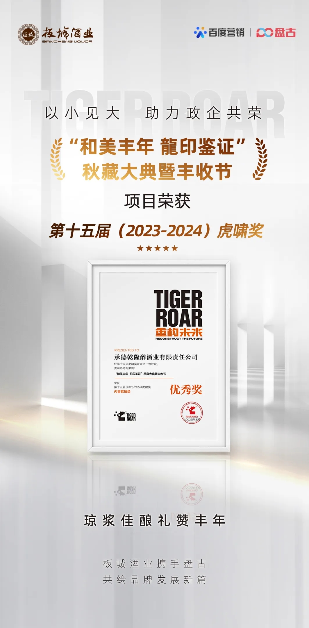近日,第十五屆虎嘯獎(jiǎng)?lì)C獎(jiǎng)典禮在上海舉辦,承德乾隆醉酒業(yè)有限責(zé)任公司憑借「“和美豐年龍印鑒證”秋藏大典暨豐收節(jié)」案例,以優(yōu)異的內(nèi)容營銷創(chuàng)意、資源整合能力及出色的營銷效果,從1020家優(yōu)秀企業(yè)提交的4505件參賽作品中脫穎而出,榮獲第十五屆(2023-2024)虎嘯獎(jiǎng)內(nèi)容營銷類優(yōu)秀獎(jiǎng)。