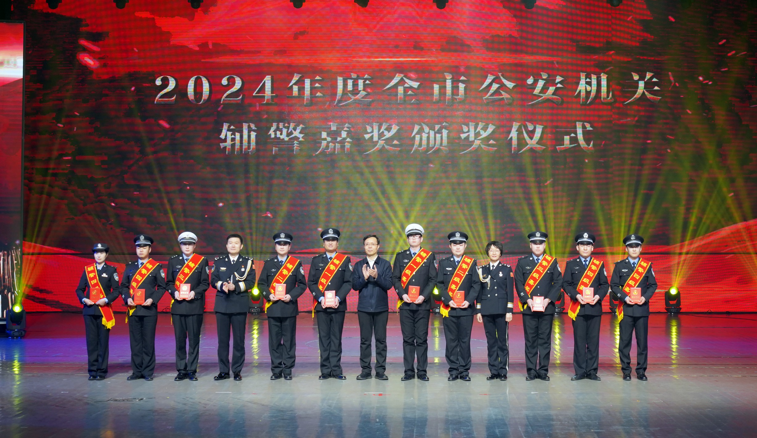 市委常委、政法委書記李曉波,省公安廳二級(jí)巡視員賈永華,市政府副市長(zhǎng)、市公安局黨委書記、局長(zhǎng)康海潮為輔警嘉獎(jiǎng)代表頒獎(jiǎng)